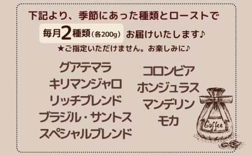 コーヒー おまかせ定期便 6回 各約400g(200g×2種) 粉 自家焙煎 定期便 6ヶ月 おまかせ コーヒー 珈琲 ドリップ 粉コーヒー コーヒー豆 挽き立て 煎りたて 焙煎仕立て 飲み比べ セット お楽しみ 飲料 コーヒー飲料 お茶 紅茶 コーヒータイム ティータイム セレクト デザート ケーキ ギフト 贈答用 お取り寄せ 千葉県 銚子市 ティピカ