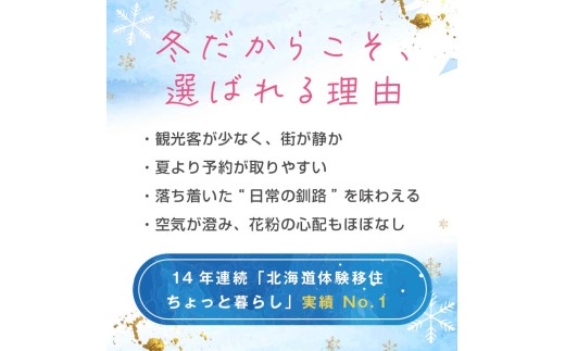 - 【北海道釧路市】長期滞在向け 長期滞在物件 割引券 100,000円分 移住 二拠点 生活 ワーケーション チケット マンション 釧路 道東 避暑 花粉ゼロ ちょっと暮らし 観光 体験 F5F-0091