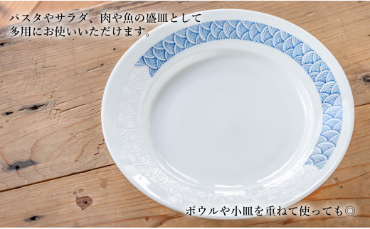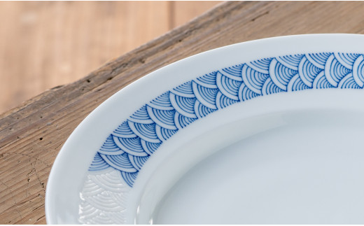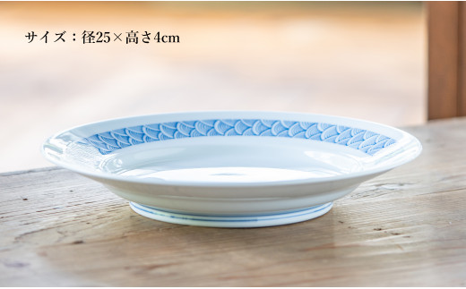 - G498p 〈平戸松山窯〉陰刻手輪青海波 25プレート 白磁陰刻 手描き 染付 食器 皿 パスタ皿 カレー皿 盛