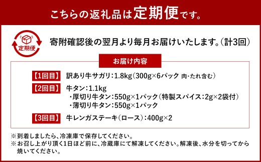 【数量限定】【3ヶ月定期便】 牛サガリ & 牛タン & 牛レンガステーキ ( ロース ) 肉盛り定期便B 計3回 合計3.7kg 牛肉 肉 サガリ タン レンガステーキ 赤身 リブロース 希少部位 味付 冷凍