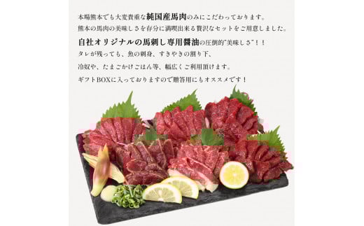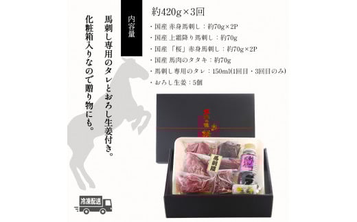 - 【 定期便 3ヶ月 】 熊本の味 純 国産 馬刺し 満喫 セット 約420g 馬肉 専用タレ付 馬肉 | 肉 にく お肉 おにく 馬 馬刺 上霜降り 赤身 タタキ 専用タレ おろし生姜 定期 熊本県 玉名市