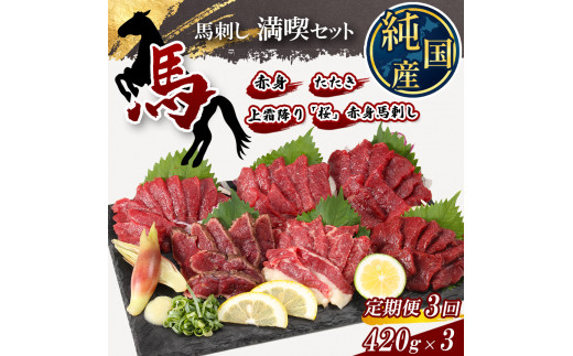 【 定期便 3ヶ月 】 熊本の味 純 国産 馬刺し 満喫 セット 約420g 馬肉 専用タレ付 馬肉 | 肉 にく お肉 おにく 馬 馬刺 上霜降り 赤身 タタキ 専用タレ おろし生姜 定期 熊本県 玉名市