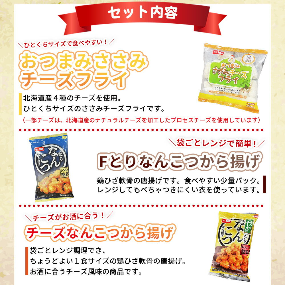 【ふるさと納税】<ちぬやの簡単おつまみ3種セット 配送回数:1/3/6回> 定期便 おつまみ おかず ささみチーズフライ プロセスチーズ とりなんこつから揚げ 鶏ひざ軟骨 チーズなんこつから揚げ 城川ファクトリー 愛媛県 西予市 【冷凍】『通常:1か月以内に順次出荷予定』