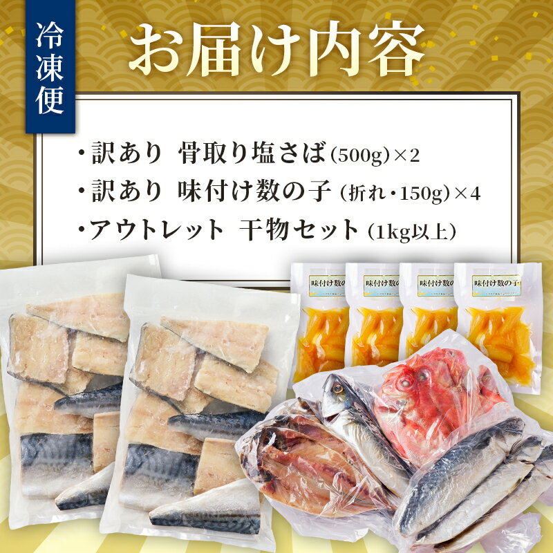 - 【ふるさと納税】 ハクダイ南房総セット 『総』 訳あり骨取り塩さば 切り身 500g×2袋 訳あり味付け数の子 折れ 150g×4袋 訳ありアウトレット干物セット 1kg以上 金目鯛入り 数量限定 特別セット 詰め合わせ 魚介 海産物 惣菜 おかず 干物 骨抜き 骨なし 送料無料
