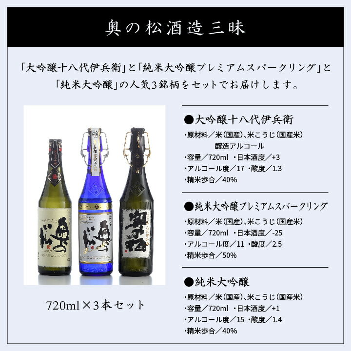 - 【ふるさと納税】 奥の松酒造三昧「大吟醸雫酒」「純米大吟醸スパークリング」「純米大吟醸」720ml×3本 酒 お酒 日本酒 四合 グルメ 父の日 敬老の日 ギフト プレゼント お中元 お歳暮 人気 おすすめ ふるさと 納税 福島 ふくしま 送料無料 【道の駅「安達」智恵子の里】