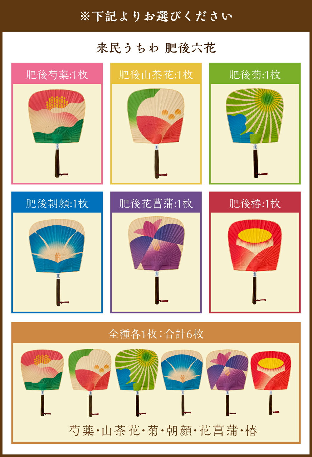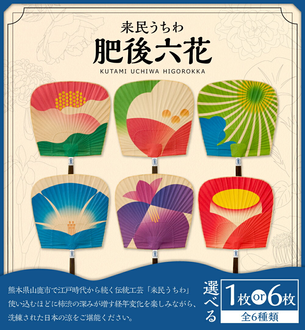 - 【ふるさと納税】<選べる種類>来民うちわ 肥後六花 1枚 / 計6枚(各1枚) 肥後芍薬 / 肥後山茶花 / 肥後菊 / 肥後朝顔 / 肥後花菖蒲 / 肥後椿 / 6種セット くたみうちわ うちわ 団扇 和紙 柿渋 竹 和風 伝統工芸品 納涼グッズ 小物 雑貨 夏 和装 和服 九州 熊本県 送料無料