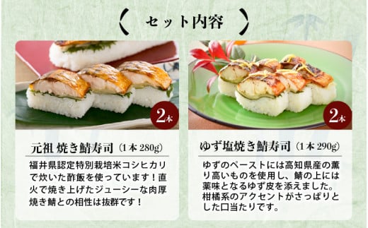 【先行予約】元祖焼き鯖寿司 4本セット! 「ゆず塩焼き鯖寿司」「元祖焼き鯖寿司」 各2本 (計4本) ~家族が喜ぶ手土産~ 【2026年3月下旬より順次発送予定】 【名物 ジューシー 焼きさば 押し寿司 さば寿司 すし こしひかり 贈答 ギフト お土産 大人気 食べ比べ】[A-0564]