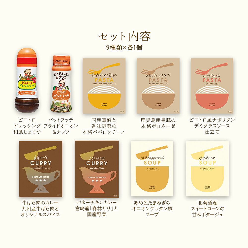 【ふるさと納税】ピエトロベストセレクションセット 9種類×各1個 ドレッシング カレー パスタ麺 調味料 スープ パスタソース 詰め合わせ 食べ比べ レトルト 長期保存 ピエトロ 送料無料