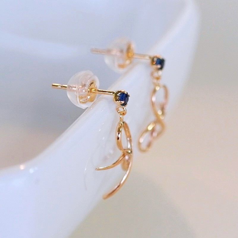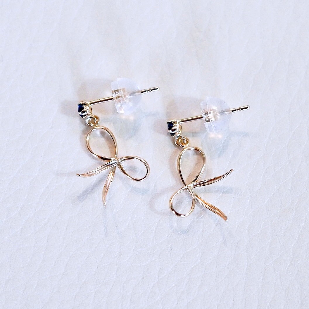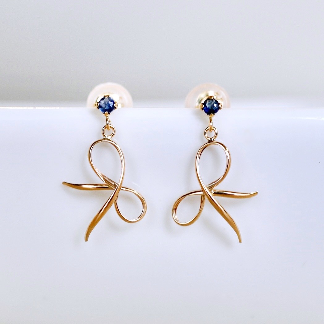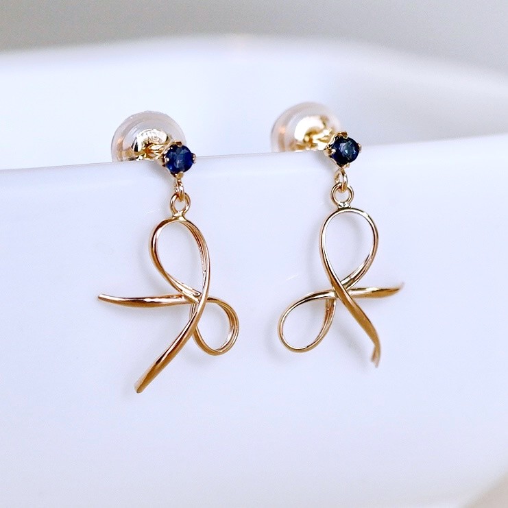 K10YG(10金) イエローゴールド 揺れる リボン サファイア 地金 ピアス 保証書付 SR-2370 242-056-e