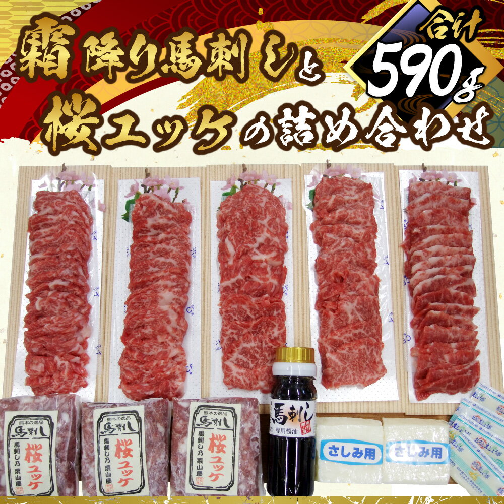 【ふるさと納税】霜降り特選馬刺しと桜ユッケの詰合せ 3種 セット 合計約590g 特選馬刺し コーネ ユッケ 専用醤油付き たてがみ 馬肉 刺し身 スライス ブロック 食べ比べ 冷凍 送料無料