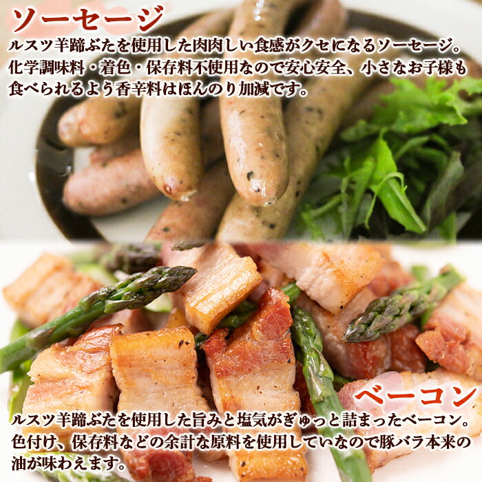【ふるさと納税】ルスツ 羊蹄ぶた ソーセージ 140g×2パック ベーコン 250g×2パック オンライン 申請 ふるさと納税 北海道 留寿都 無添加 豚肉 豚 肉 BBQ 焼肉 アウトドア 朝食 お弁当 おかず 惣菜 おつまみ 留寿都産 国産 留寿都村【2200801】