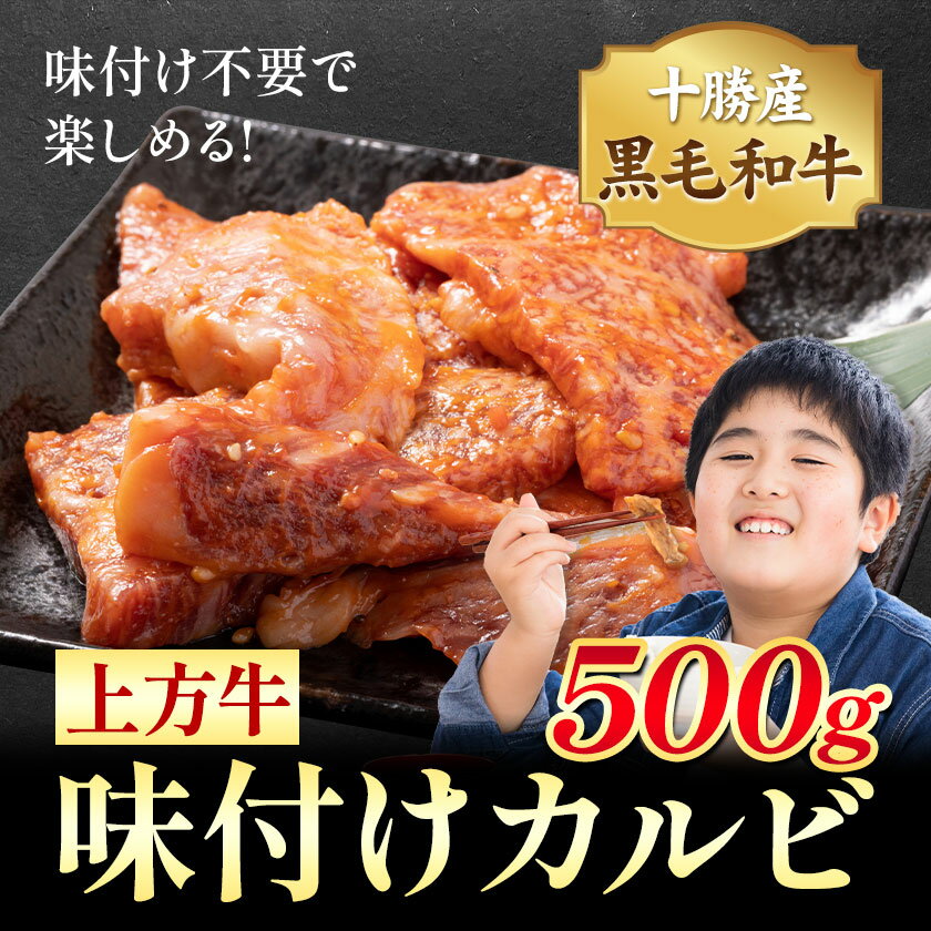 - 【ふるさと納税】十勝産 黒毛和牛 上方牛 味付けカルビ 500g 上方牧場《30日以内に出荷予定(土日祝除く)》北海道 本別町 肉 送料無料 カルビ 味付き 焼肉 惣菜