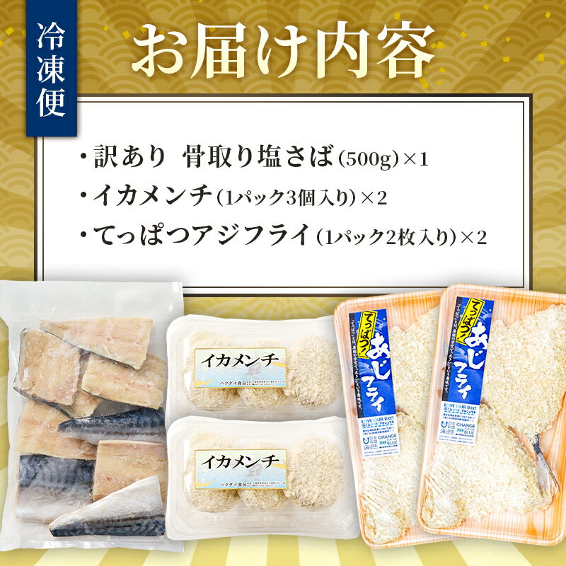 - 【ふるさと納税】 ハクダイ南房総セット 『南』 訳あり骨取り塩さば 切り身 500g イカメンチ 3個×2パック てっぱつあじフライ 2枚×2パック 数量限定 特別セット 詰め合わせ 魚介 海産物 惣菜 おかず 揚げ物 お弁当 骨抜き 骨なし 冷凍 千葉県 南房総市 送料無料