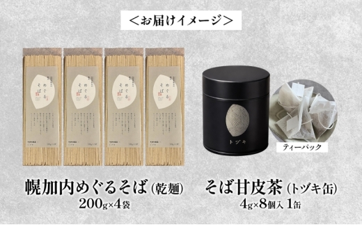 - [№5795-0435]幌加内 めぐるそば 乾麺 200g×4 そばの甘皮茶 トヅキ缶 4g×8個入 1缶 セット 蕎麦 ソバ 干しそば 麺 熟成 お茶 甘皮 焙煎 ティーバッグ 甘味 ギフト プレゼント 贈り物 送料無料 北海道 幌加内町