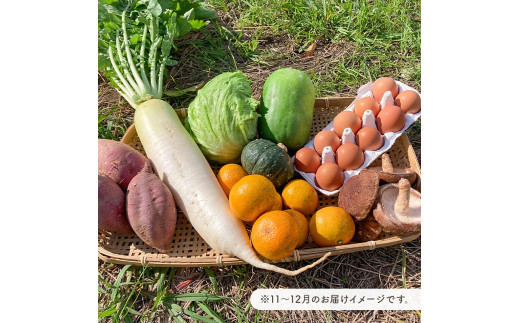 - 11月発送 農薬・化学肥料を持たない農家の野菜(7~10種類)と 平飼有精卵のセット mi0036-0017-11 【野菜 卵 露地栽培 国産 旬野菜 季節野菜 キャベツ きゅうり トマト 果物 蒟蒻 味噌】