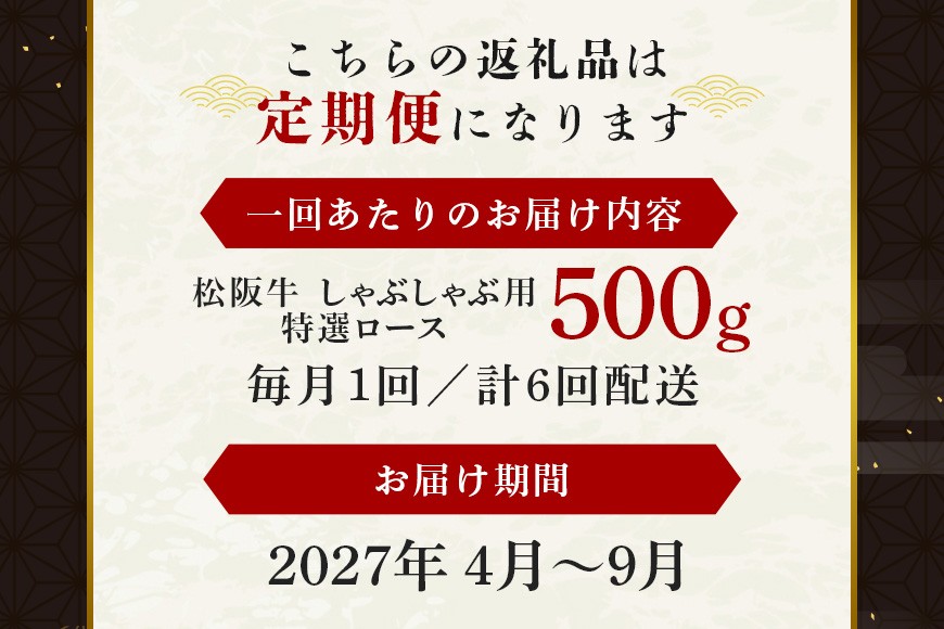 【受付時期・発送時期限定】 定期便 松阪牛 しゃぶしゃぶ (特選ロース) 月1回 合計6回発送 / 瀬古食品 ふるさと納税 牛肉 松阪肉 名産 ブランド 霜ふり本舗 三重県 大台町 [376]