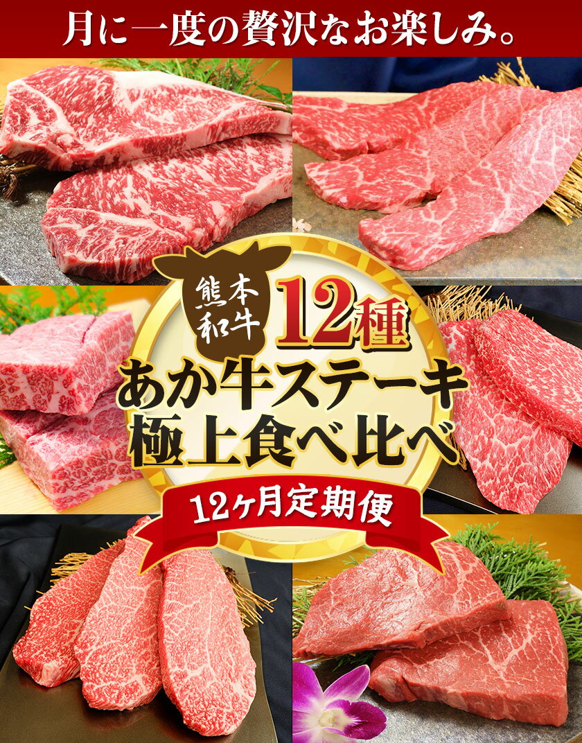 - 【ふるさと納税】【12ヶ月定期便】あか牛 ステーキ 12種 極上 食べ比べ 定期便 12回《お申込み翌月から出荷》有限会社 三協畜産 サーロイン ランプ 肩ロース イチボ 三角バラ カイノミ ミスジ クリミ ザブトン シャトーブリアン リブロース モモ あか牛のたれ付き