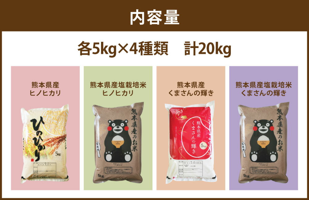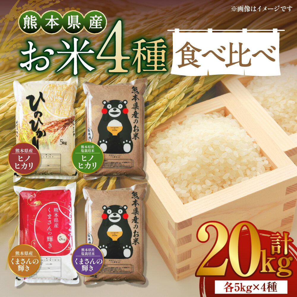 - 【ふるさと納税】【令和7年度産】熊本県産のお米 4種類 食べ比べ 計20kg(5kg×4種) ヒノヒカリ・塩栽培米ヒノヒカリ・くまさんの輝き・塩栽培米くまさんの輝き お米 こめ コメ 白米 精米 単一原料米 ごはん ご飯 詰め合わせ おにぎり お弁当 国産 九州 熊本県 送料無料