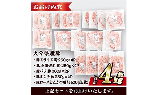 <1回配送> 豚肉 バラエティーパック (合計4kg) 豚バラ しゃぶしゃぶ 鍋 とんかつ ロース 小分け 個包装 豚こま 小間切れ スライス ミンチ 5種 セット 詰め合わせ 冷凍 食べ比べ 国産 大分県 佐伯市【BD325】【西日本畜産】