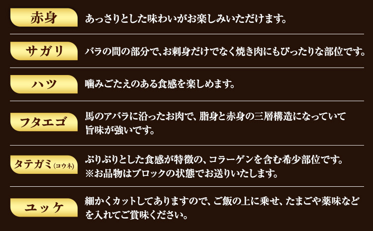 馬刺し 6種 セット 420g 醤油 タレ 付き 桜屋《60日以内に出荷予定(土日祝除く)》 熊本県 山江村 送料無料 肉 馬肉 馬さし 赤身 タテガミ ハツ サガリ フタエゴ ユッケ
