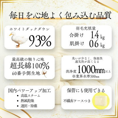 【ふるさと納税】【オールシーズン対応】日本製 2枚合わせ 羽毛布団 ダブル ダウン93% 合掛け1.4kg+肌掛け0.6kg ホック連結 380dp以上 超長綿60番手 奈良県河合町 一年中 合掛け かけ布団 肌布団 軽い ふっくら ふんわり ふわふわ もこもこ 高機能 春 夏 秋 冬 暖かい