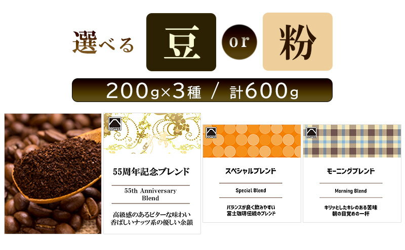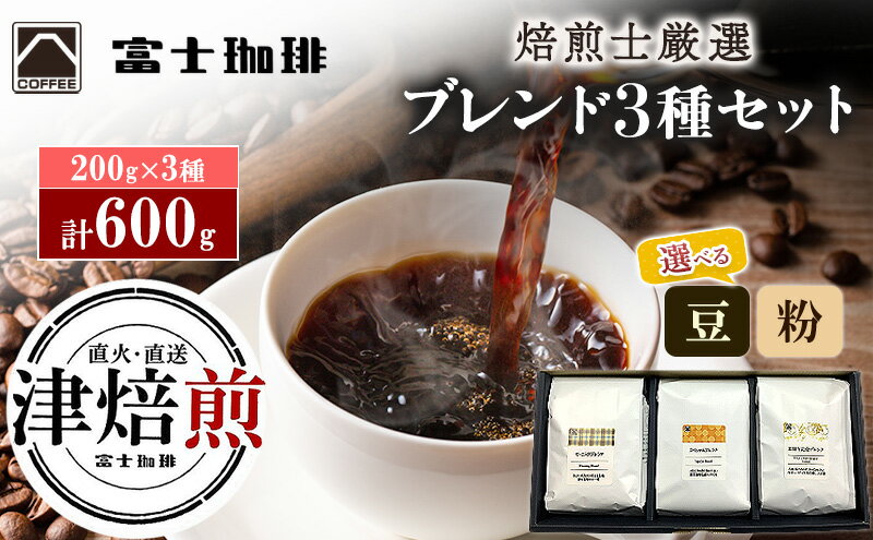 【ふるさと納税】富士珈琲 焙煎士厳選【3種セット】 オリジナルブレンドコーヒー 飲み比べ ( 200g×3種 / 計600g )|選べる種類 ( 豆 / 粉 )オリジナルブレンド コーヒー 粉 豆 珈琲 ギフト ブレンド 贈り物 贈答 プレゼント 三重県 津市