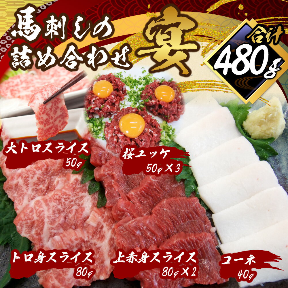 【ふるさと納税】馬刺しの詰合せ 「宴」 5種 合計約480g 大トロ トロ身 上赤身 コーネ ユッケ たれ 生姜付き 馬肉 たてがみ 赤身 刺し身 食べ比べ 冷凍 送料無料