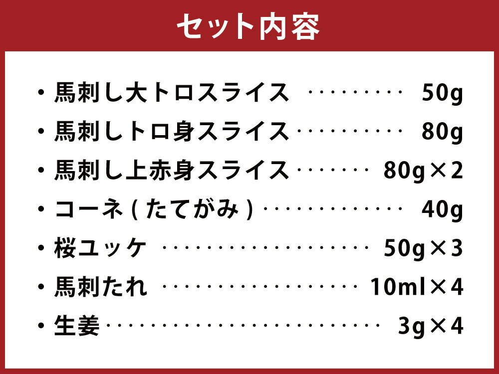 【ふるさと納税】国産 ご家族で楽しめる「さくらセット」5種 合計約380g 上赤身 馬刺し 霜降り 大トロ ロース たてがみ ふたえご ユッケ タレ 付 馬肉 桜肉 冷凍 送料無料