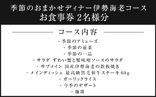 鉄板ニシムラ本店 吉祥寺 季節のおまかせディナー伊勢海老コース(ペア) 食事券 食事チケット 券 チケット ディナー券 ディナーチケット ディナー コース料理 鉄板焼 ペア 東京都 武蔵野市