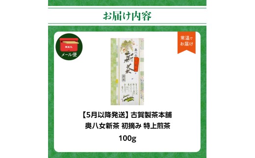 - 古賀製茶本舗 奥八女初摘み新茶 特上煎茶100g【2026年5月以降発送】 【メール便】 お茶 緑茶 新茶 高級 八女茶 ポスト投函 簡易包装 訳あり 福岡県 八女市