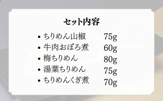 【わらびの里】京ちりめん 5種セット |京都 老舗料亭 ちりめん山椒 人気セット[ 京都 料亭 京料理 懐石 人気 おすすめ ちりめん山椒 ご飯のお供 お取り寄せ 通販 送料無料 ふるさと納税 ]