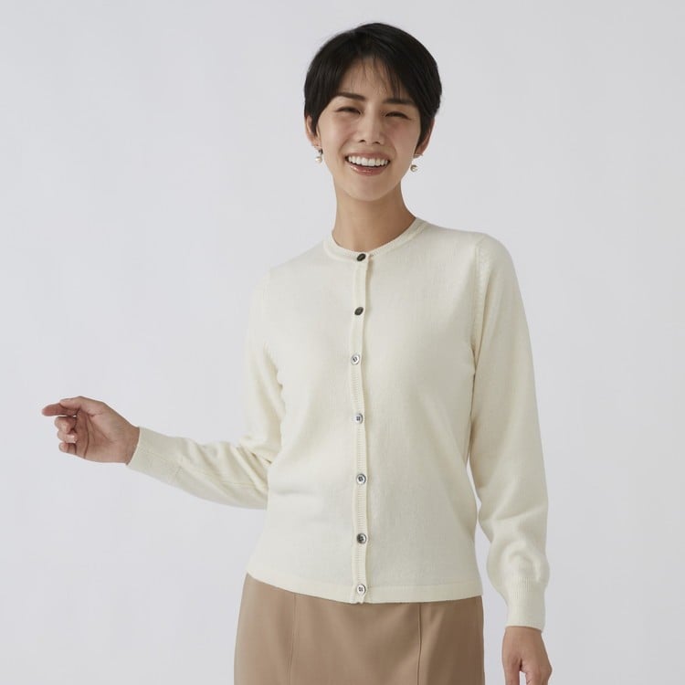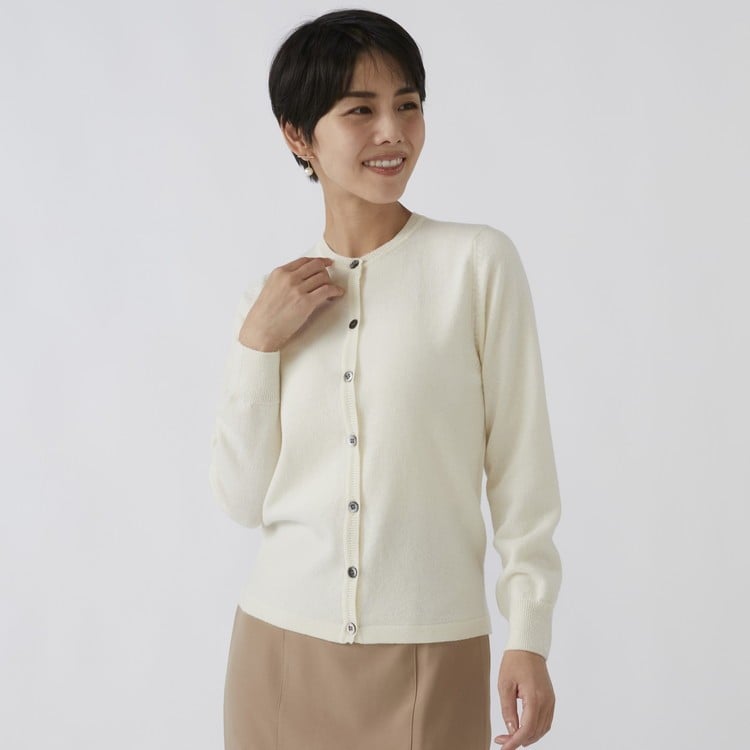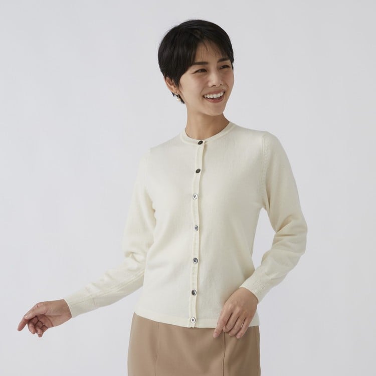 - 日本製 カシミヤ100% レディース クルーカーディガン オフホワイト 2Lサイズ