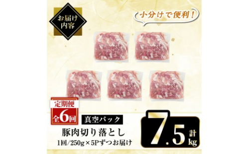 A5-033-F 【6回定期便】国産!鹿児島県産豚肉切り落とし真空小分け <250g×5P>×6回 計7.5kg【肉の豊楽】霧島市 肉 豚肉 切り落とし 小分け 真空パック 切落し 定期便