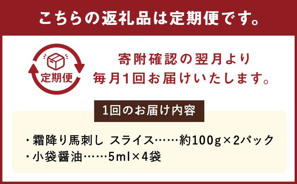 - 【ふるさと納税】【選べる定期便】馬刺し 霜降りスライス 3ヶ月定期便 / 6ヶ月定期便 1回のお届けにつき約200g 約100g×2パック 醤油4袋 馬刺し 霜降り スライス済み 馬肉 刺身 おつまみ 冷凍 送料無料