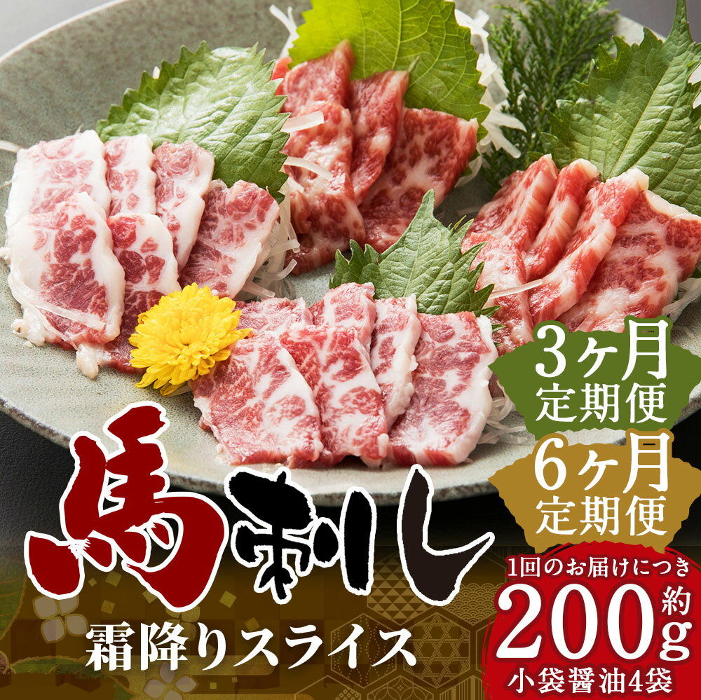 【ふるさと納税】【選べる定期便】馬刺し 霜降りスライス 3ヶ月定期便 / 6ヶ月定期便 1回のお届けにつき約200g 約100g×2パック 醤油4袋 馬刺し 霜降り スライス済み 馬肉 刺身 おつまみ 冷凍 送料無料
