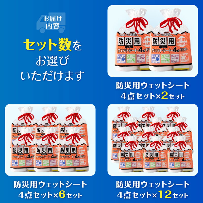 【ふるさと納税】 ウェットシート 防災用 4点セット 選べるセット数 2セット/6セット/12セット 外出 アウトドア 運動後 緊急時 手軽 便利 衛生 防災 断水 備蓄 常備 富士市 [sf002-575-577]