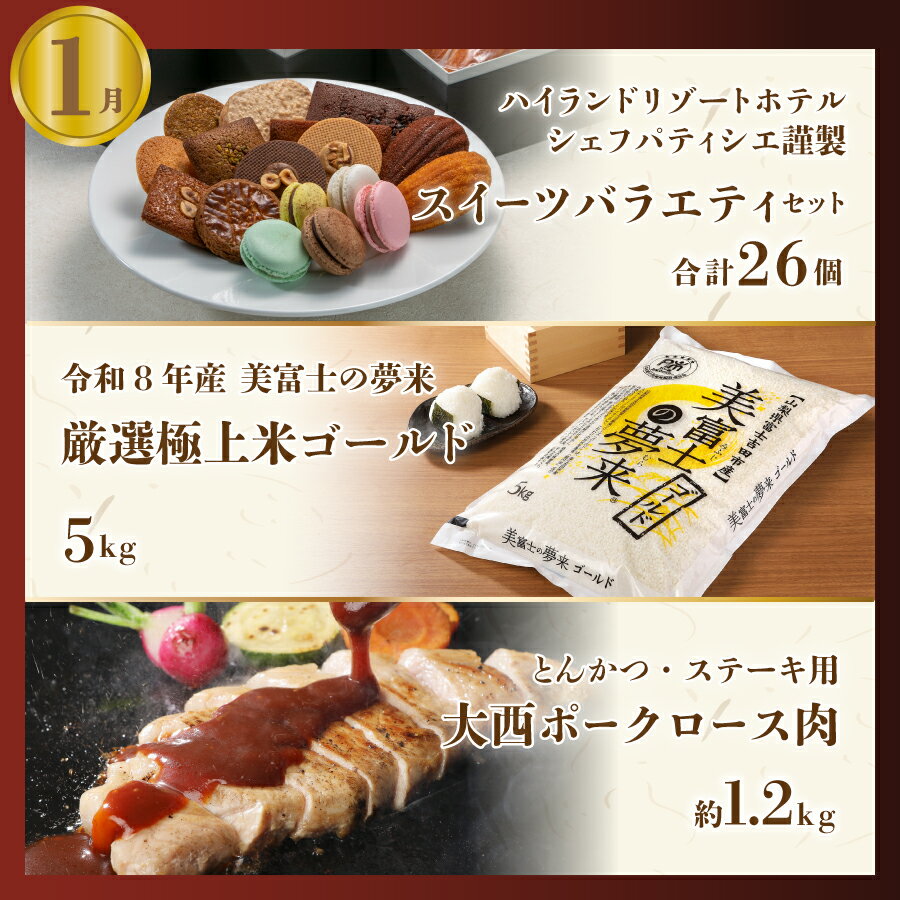 【ふるさと納税】 定期便 【厳選特産品が毎月届く】 お楽しみ 12ヶ月 富士吉田 プレミアム 米 富士山麓牛 赤身肉すき焼き ロースステーキ 肩ロース ハンバーグ 焼肉 牛肉 豚肉 馬刺し サーモン ビール 水 炭酸水 コーヒー フルーツ スイーツ お菓子 和菓子 ご馳走定期便