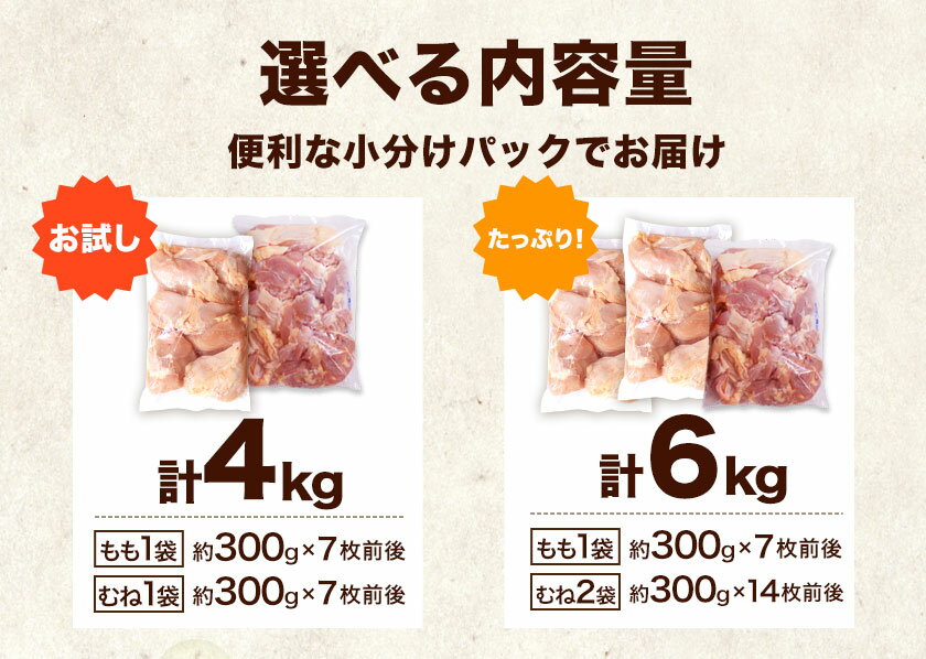 - 【ふるさと納税】\食べ比べのセット/大容量 鶏肉 選べる 内容量 熊本県産 計4kg または 計6kg 《30日以内に出荷予定(土日祝除く)》モモ肉 モモ 若鶏モモ 鶏モモ ムネ 鶏ムネ ムネ肉 若鶏ムネ