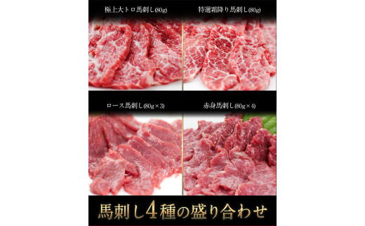 熊本特産馬刺し 馬刺し4種の盛り合わせ 《30日以内に出荷予定(土日祝除く)》 【極上大トロ馬刺し80g/特選霜降り馬刺し80g/ロース馬刺し80g×3/赤身馬刺し80g×4】+タレ360ml付き st-p