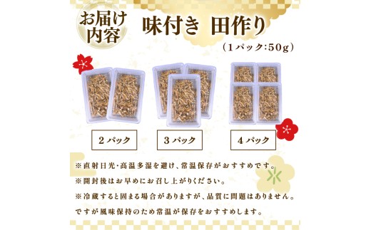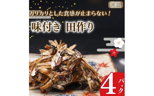 - 【期間限定 田作り】味付き 田作り 50g × 4パック つくだ煮 佃煮 ごはんのお供 おせち 逸品 一品 定番 ごはん 米 おつまみ ごはん カリカリ 常温保存 お弁当 お酒に合う 子供 食べやすい 老若男女 おにぎり 海鮮 甘辛 栄養 たづくり お弁当 朝食 おにぎり こめ 魚 新鮮 おかず 海産物 さかな 海の幸 人気 おすすめ 静岡県 牧之原市 マルカ名波