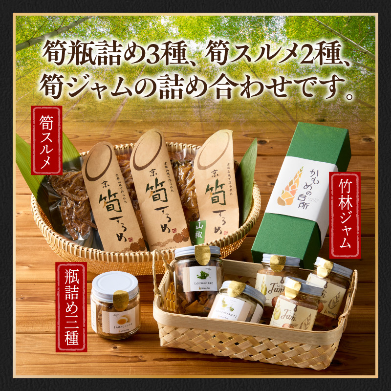 - 山城筍セット たけのこ 筍 竹の子 筍瓶詰め3種 和洋中(山椒味、メンマ、オイル) 筍スルメ(プレーン、山椒入り) 筍ジャム3個 おつまみ お茶漬け ごはんのおとも お茶請け パン クラッカーにつけて 山城特産品 たけのこ 京都府 木津川市【019-20】