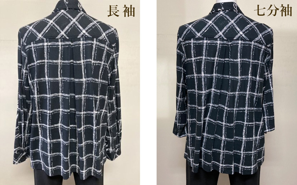 ニットブラウス ブラック 1枚 <選べる長さ> (長袖・七分袖) / ブラックブラウス シャツカラーブラウス 長袖ブラウス 七分袖ブラウス 綿100%ブラウス レディースブラウス きれいめカジュアルブラウス シンプルブラウス ゆったりブラウス 春夏ブラウス 前すっきりブラウス 後ろゆったりブラウス オフィスカジュアルブラウス レディーストップス 広島県 No.1223