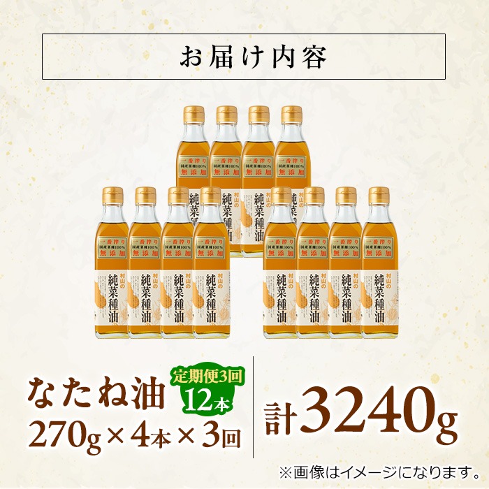 【0361301b】<定期便・全3回(2ヶ月毎)>国産菜種油を100%使用!村山の純菜種油(270g×4本×3回)油 調味料 オイル ナタネ油 なたね油 揚げ物 天ぷら【村山製油】
