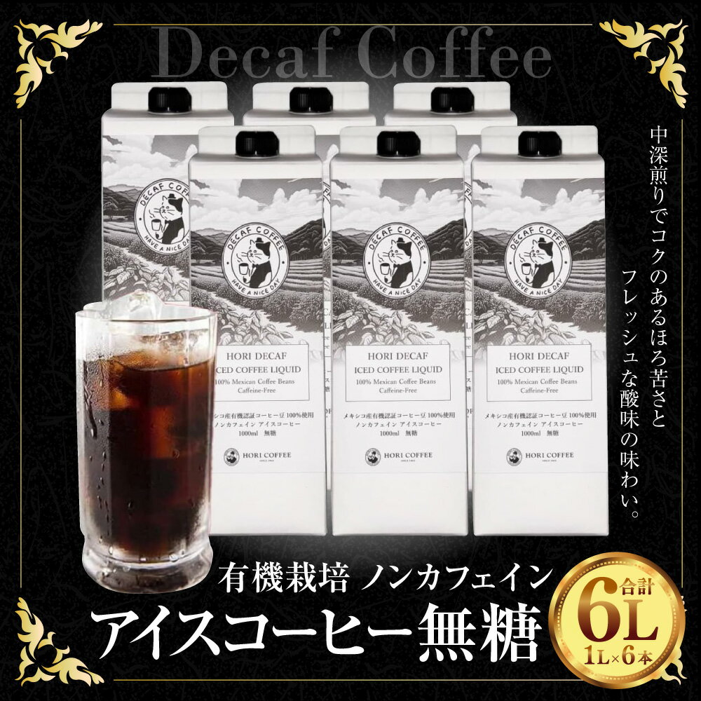 【ふるさと納税】有機栽培 ノンカフェイン アイスコーヒー 無糖 計6L(1L×6本入り) コーヒー豆 珈琲 中深煎り 有機肥料栽培 飲料 三重県 桑名市 送料無料 【2026年7月下旬~10月下旬発送予定】