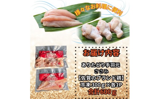 - 【佐賀県のブランド鶏】個装で便利!! ありたどり 手羽元&ささみ セット 合計600g(300g×各1P) 188-L098