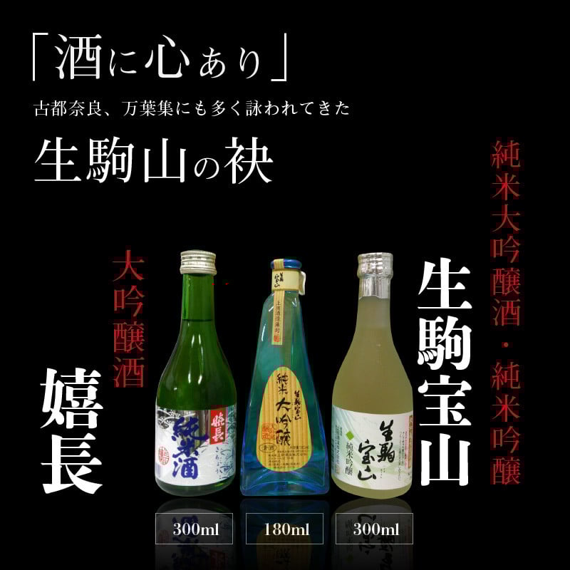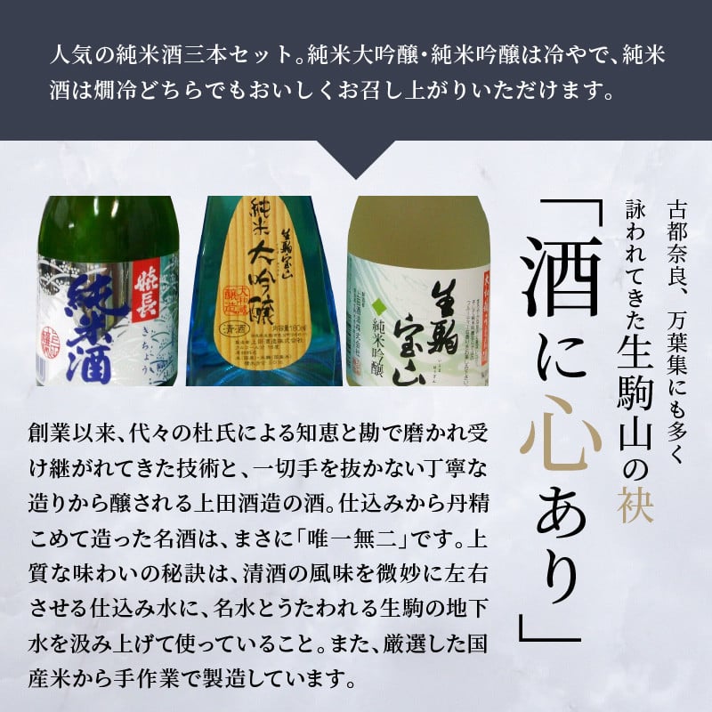 - 純米酒3本セット 純米大吟醸180ml 純米吟醸300ml 嬉長純米酒300ml 酒 純米酒 3本 セット こだわり 純米酒セット 純米大吟醸 純米吟醸 生駒宝山 嬉長純米酒 お酒 フルーティ 芳醇 辛口 名酒 米 日本酒 銘酒 美酒 老舗 上田酒造株式会社 お取り寄せ 飲料 飲み物 上田酒造株式会社 奈良県 生駒市 送料無料