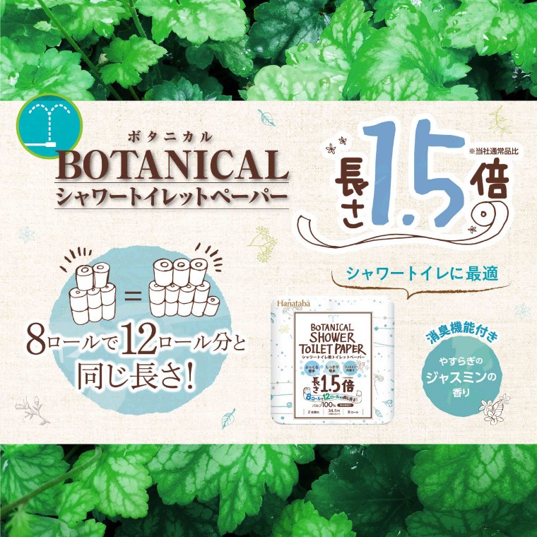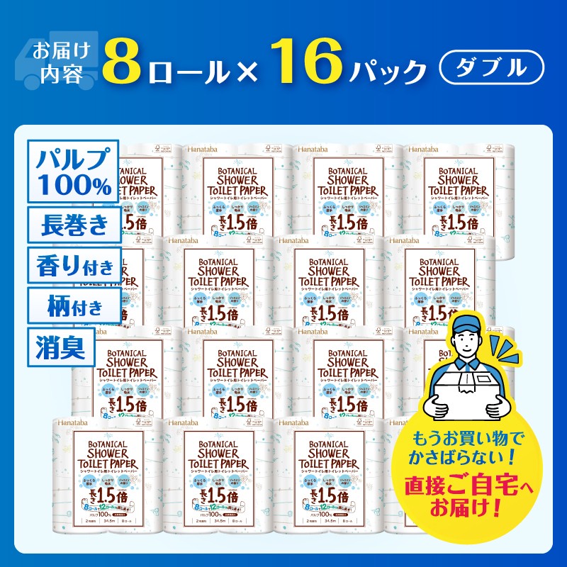 - 1.5倍巻き トイレットペーパー Hanataba ボタニカルシャワー ダブル 128ロール シャワートイレ用 パルプ100% 吸水性 長持ち ジャスミンの香り 消臭 192ロール相当 備蓄 日用品 消耗品 富士市 [sf002-604]