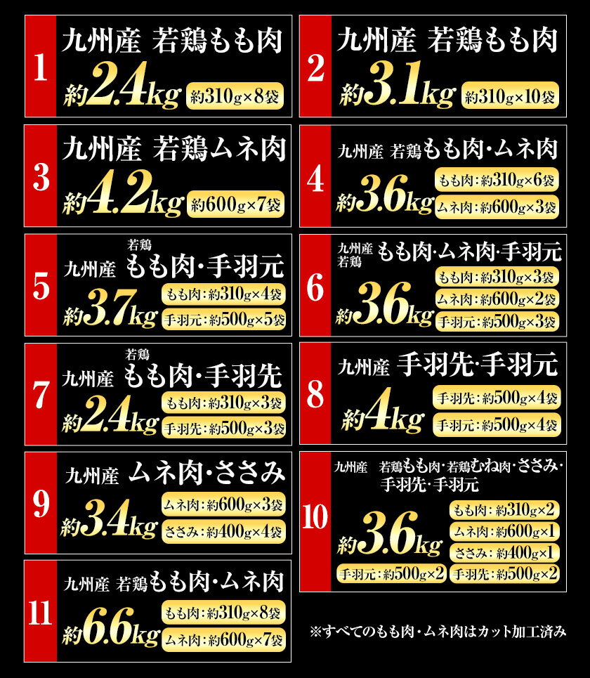 - 【ふるさと納税】【選べる11種】約2.4kg〜6.6kg 九州産 鶏肉 若鶏 もも肉/ムネ肉 /もも肉・ムネ肉/もも肉・手羽元/もも肉・ムネ肉・手羽元/もも肉・手羽先/手羽先・手羽元/ムネ肉 ・ささみ/もも肉・むね肉・ささみ・手羽先・手羽元 /30日以内に出荷予定(土日祝除く)