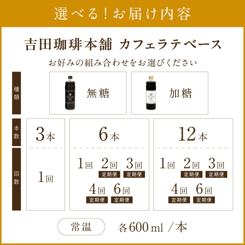 - 【ふるさと納税】【吉田珈琲本舗】 選べる 種類・本数・お届け回数! カフェラテベース 3本 6本 12本 無糖 加糖 1回~6回 定期便 コーヒー 珈琲 セット ふるさと納税 コーヒー 加糖 ふるさと納税 珈琲 加糖 ふるさと納税 コーヒー 無糖 【配送不可地域:北海道・沖縄・離島】