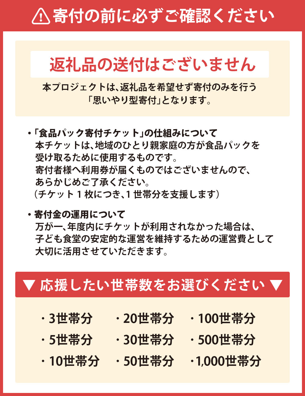 【ふるさと納税】<選べる枚数>【思いやり型返礼品】ひとり親家庭応援食品パック寄付チケット 3枚(3世帯分)~1000枚(1000世帯分) 返礼品なし 寄付のみ 寄附のみ 支援 応援 あこう子ども食堂 ごはん ご飯 こども 子供 兵庫県 赤穂市